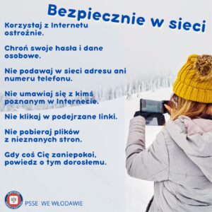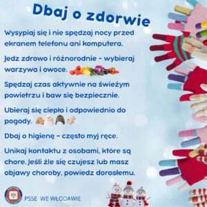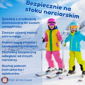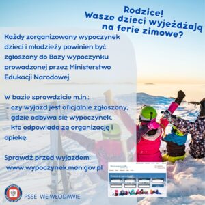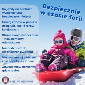 Państwowy Powiatowy Inspektor Sanitarny we Włodawie zwraca się z uprzejmą prośbą o rozpowszechnienie wśród dzieci oraz ich rodziców informacji dotyczących zasad bezpiecznego i odpowiedzialnego wypoczynku w okresie ferii zimowych. Celem działań jest zwiększenie wiedzy o zagrożeniach zdrowotnych podczas zimowego wypoczynku dzieci. Działania te uczą bezpiecznych zachowań, zasad zabawy na świeżym powietrzu oraz dbania o zdrowie. Ważne jest także pokazanie, jak reagować w sytuacjach niebezpiecznych dla zdrowia i życia.